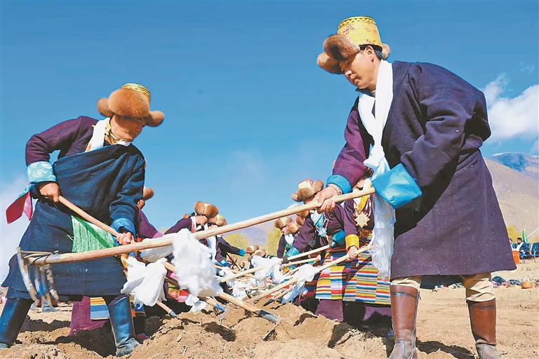 開耕儀式上,村民身著節(jié)日盛裝,聚在田間地頭,拖拉機等農機設備擦拭一新,機頭鮮艷的五星紅旗迎風招展。大家捧出切瑪盒,一字排開,互獻哈達、互敬青稞酒、同唱祝福歌,每個人臉上都洋溢著對豐收年景的期盼。
