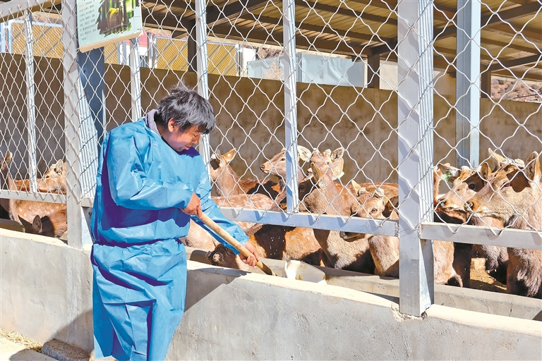 基地工作人員正在往鹿舍食槽里補(bǔ)充干飼料。記者 謝筱純 攝
