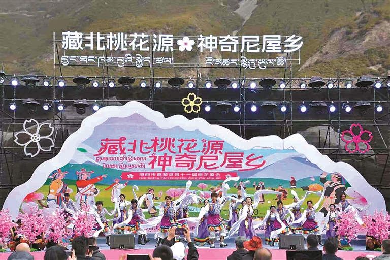 圖為那曲市嘉黎縣第十一屆桃花盛會開幕式文藝演出。記者 汪純 趙書彬 攝