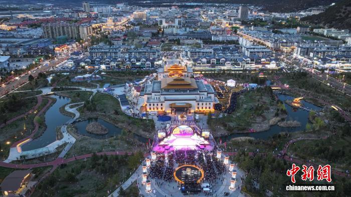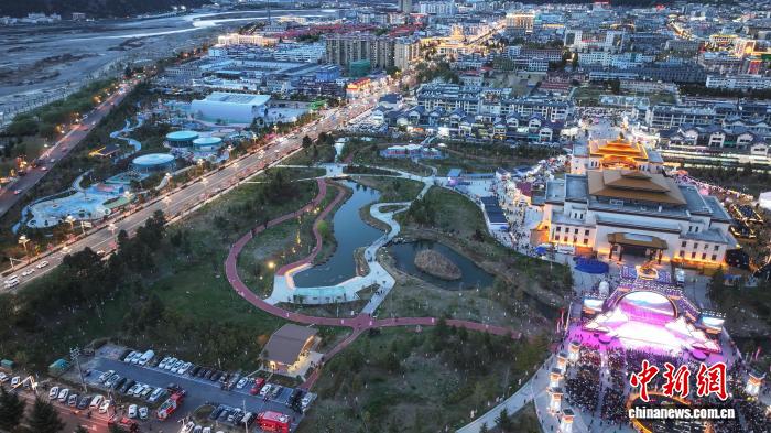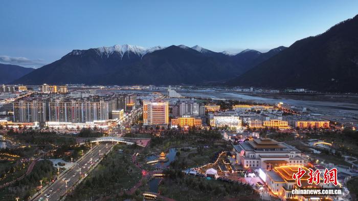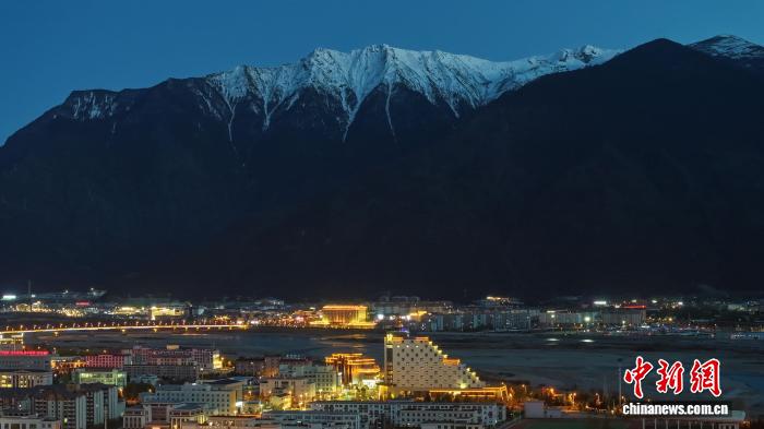 4月3日晚,西藏林芝市城市夜景美,城市建筑、街道的燈光與雪山相映成趣,景色美麗。(無人機(jī)照片)中新社記者 貢嘎來松 攝