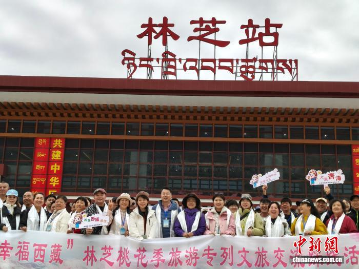 11日,“大美青海·幸福西藏”桃花季旅游專列緩緩駛?cè)肓种セ疖囌荆?30余名游客即將在林芝開啟賞花之旅。