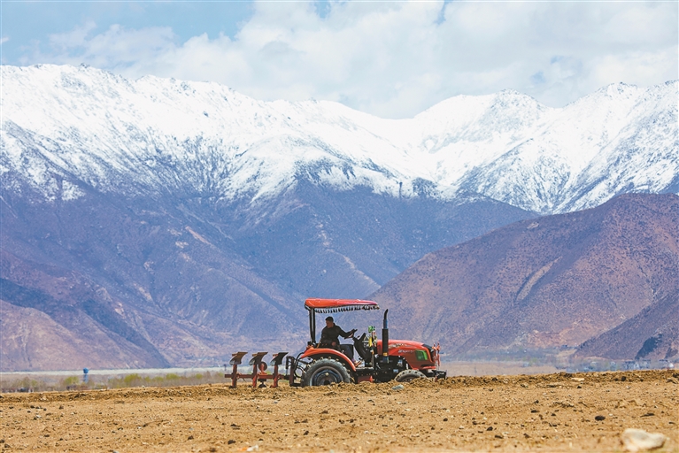 在拉薩市墨竹工卡縣唐加鄉(xiāng)拉東村,大型農(nóng)機(jī)來(lái)回穿梭在田野間翻耕新土。記者 王敏 通訊員 洛克 攝