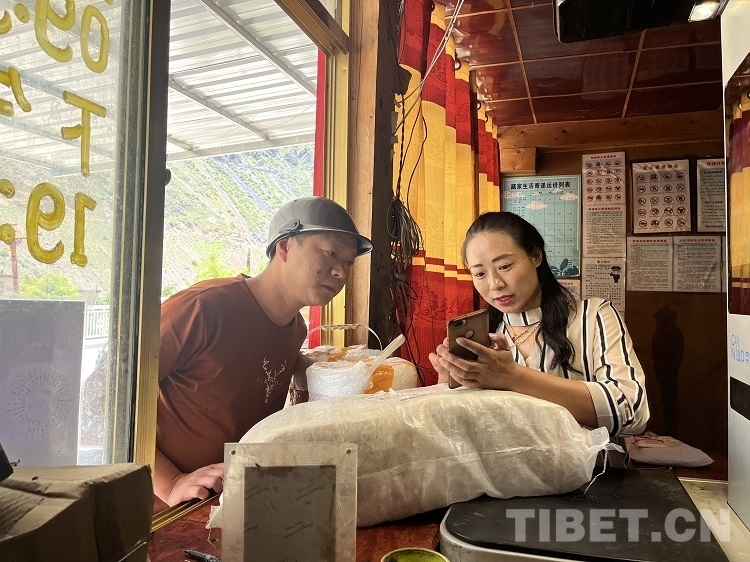 圖為斯郎擁珍幫助村民取快遞包裹 攝影:盛芳