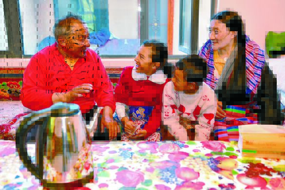從雙湖縣多瑪鄉(xiāng)搬遷到森布日安置點新居的牧民索朗措加(左一)和妻子查格(右一),與孫女旦珍卓嘎(左二)和孫子歸桑桑旦一起聊天(七月十九日攝)。