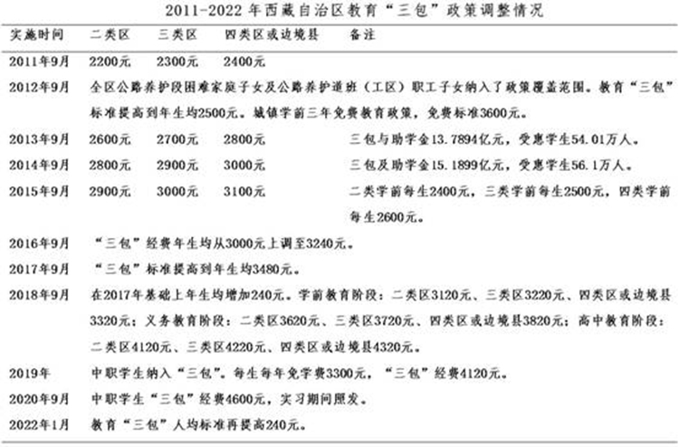 黨的十八大以來,“三包(包吃、包住、包學(xué)費)”人均標(biāo)準(zhǔn)不斷大幅提升。2012年起,西藏全面落實15年公費教育“三包”政策。同年底,西藏“三包”年總經(jīng)費由2008年的3.61億元增加到12.29億元,年均增幅達(dá)36%,受惠學(xué)生增加到51萬人。 到2014年,西藏“三包”經(jīng)費增加到15.19億元,全區(qū)有52.5萬名學(xué)生受益,覆蓋面100%,實現(xiàn)了由“選擇性保障”到“覆蓋式保障”。 中央第六次西藏工作座談會后,投入力度更大。1985-2015年30年間,西藏“三包”經(jīng)費累計投入逾80億元, 而到2020年35年投入超200億元。僅2016-2020年,西藏教育“三包”資金投入達(dá)104.74億元,年均增幅11.4%。 從1985年到2020年的35年間,西藏教育“三包”政策累計調(diào)整20次,2011-2020年的10年間,就調(diào)整了10次。2022年1月,“三包”人均標(biāo)準(zhǔn)再次提高。在比如縣,2021年底全縣享受“三包”及助學(xué)金的學(xué)生達(dá)到17771人, 占比如縣總?cè)丝诘?4.5%。