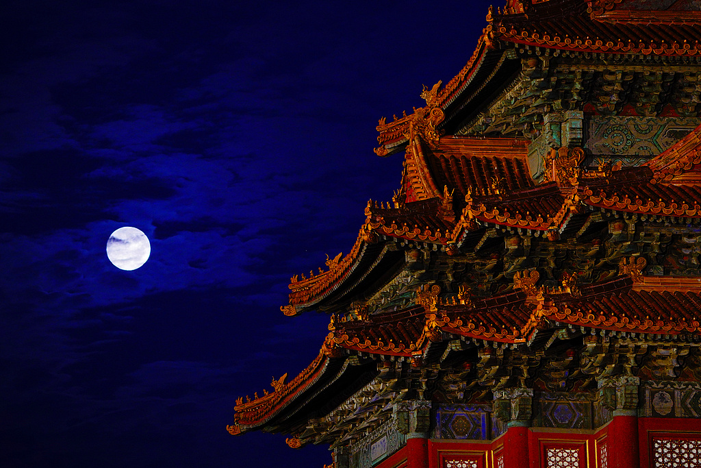 北京,夜幕降臨,一輪圓月現身夜空,偶有彩云相伴。圓月與故宮角樓、角樓脊獸同框,仿佛穿越古今。