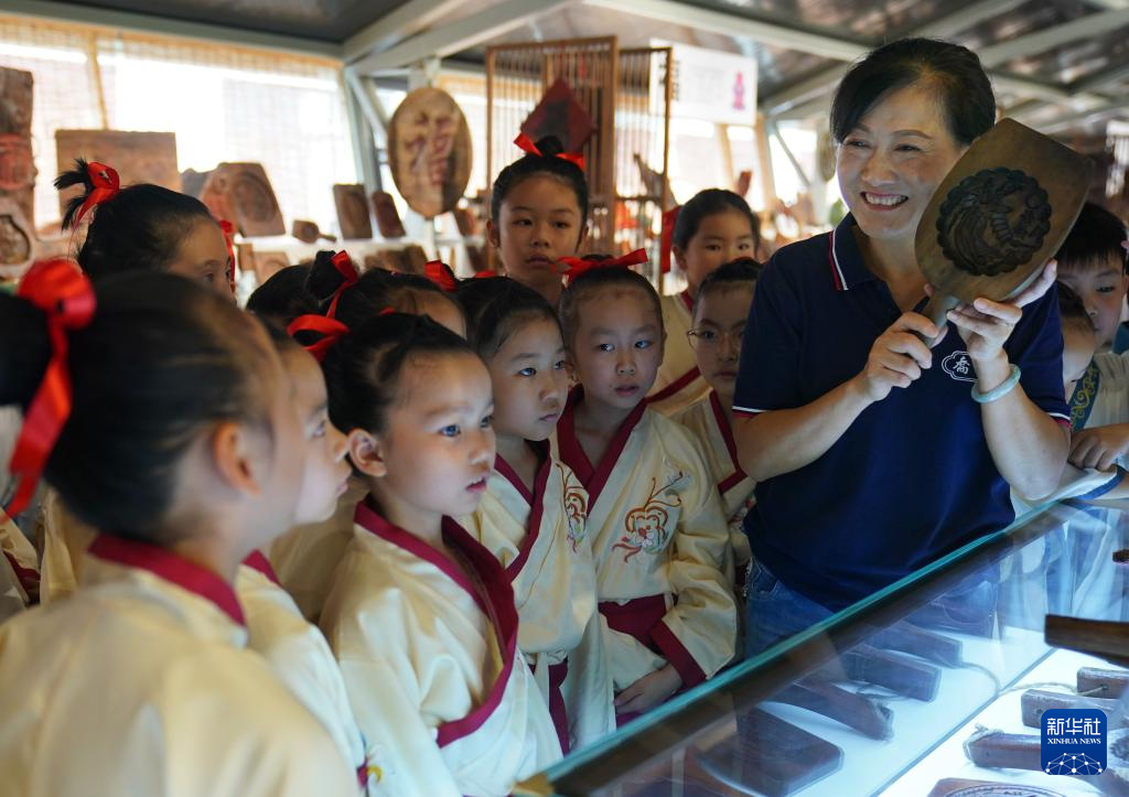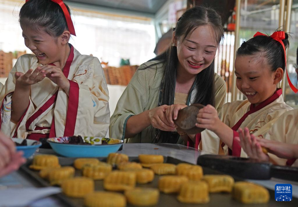 9月11日,孩子們在參觀傳統(tǒng)手工糕餅?zāi)>?。新華社記者 萬象 攝