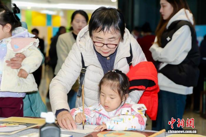 當(dāng)天,宋慶齡青少中心一層中庭熱鬧非凡,書法、國畫、版畫三大傳統(tǒng)藝術(shù)體驗區(qū)同步開放,吸引眾多長輩參與。書法區(qū)墨香陣陣,“?!薄皦邸薄爸仃柊部怠钡扰R摹帖整齊擺放,長者握筆書寫,教師在一旁細(xì)心指導(dǎo)握筆姿勢,不少作品中留下了對晚輩的溫情祝福。