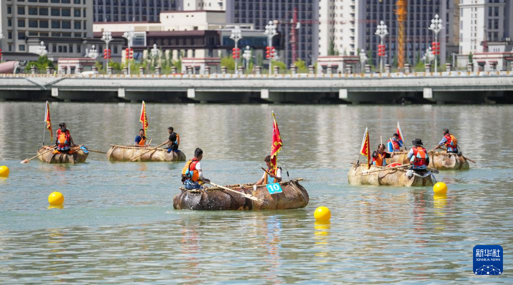 5月31日,參賽隊(duì)伍在牛皮船比賽中。新華社記者 晉美多吉 攝
