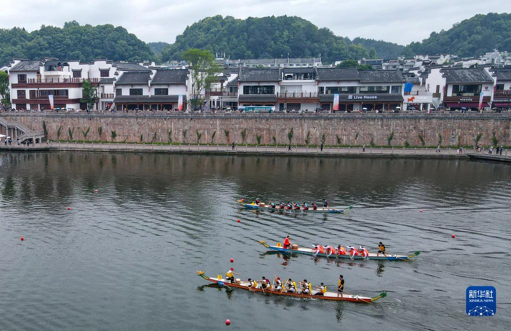 6月18日,龍舟隊(duì)在安徽省黃山市屯溪區(qū)新安江水域上展開角逐。