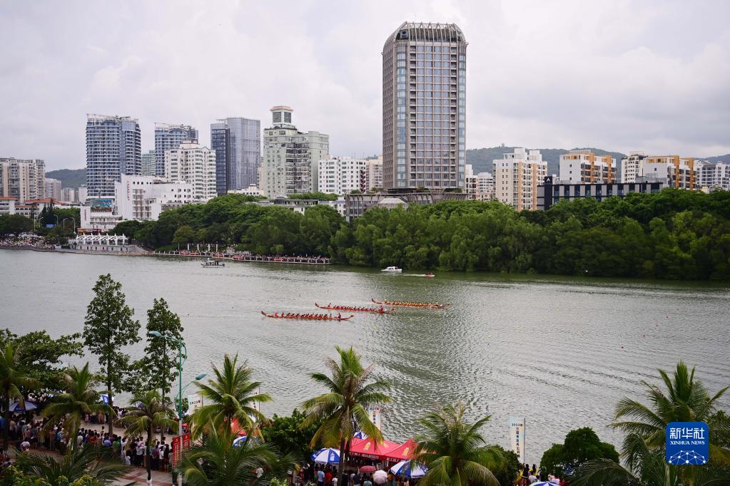 6月18日,龍舟隊(duì)在海南省三亞市三亞河上進(jìn)行比賽。新華社發(fā)(沙曉峰攝)