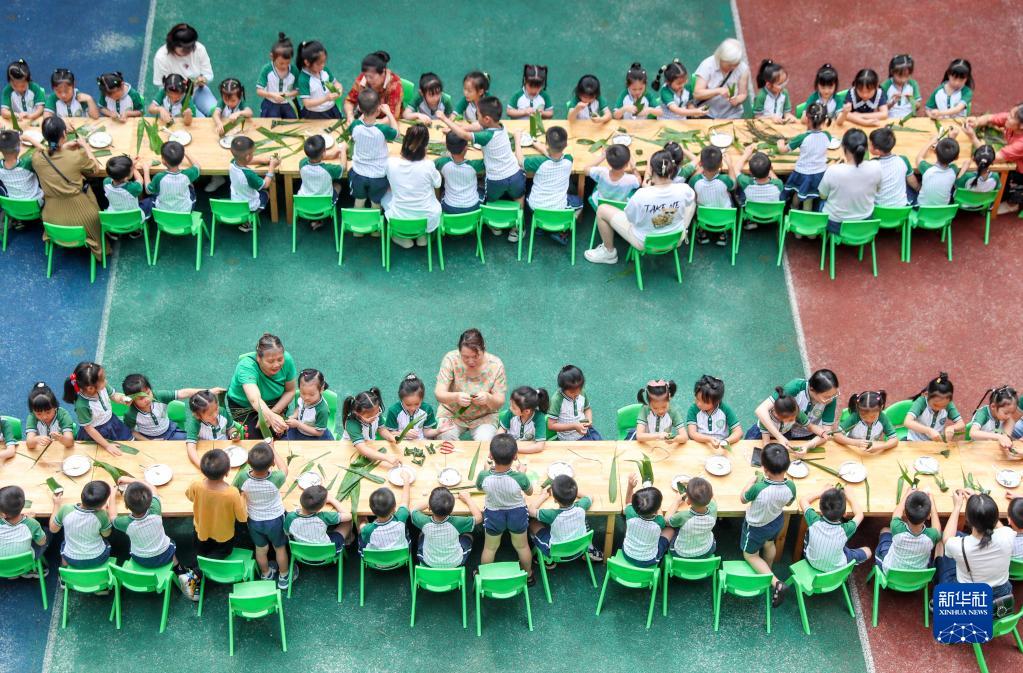 6月19日,貴州省遵義市余慶縣羽翅幼兒園的孩子們?cè)趯W(xué)習(xí)包粽子。新華社發(fā)(王永娟 攝)