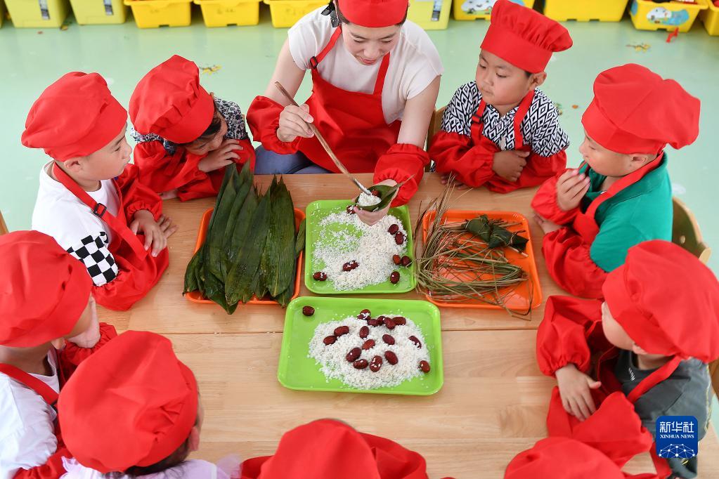 6月19日,在河北省邯鄲市廣平縣第四幼兒園,小朋友在家長(zhǎng)的幫助下學(xué)習(xí)包粽子。新華社發(fā)(程學(xué)虎 攝)