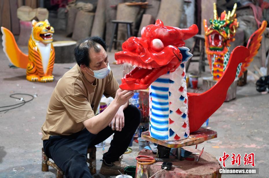 “世界龍舟看中國(guó),中國(guó)龍舟看福州,福州龍舟看方莊?!蔽挥诟=ㄊ「V菔虚}侯縣的方莊村,是中國(guó)最大的龍舟制造村,有著七百多年制作龍舟的歷史。隨著端午節(jié)臨近,方莊村內(nèi)的龍舟制造廠里,工匠們正加班加點(diǎn)趕制端午節(jié)的龍舟訂單。據(jù)統(tǒng)計(jì),目前該村每年能接到超過(guò)200艘龍舟的訂單,總產(chǎn)值約600萬(wàn)元人民幣。圖為5月25日,在方莊村的一家龍舟龍頭制造廠里,師傅正在制作各式龍頭。中新社記者 張斌 攝
