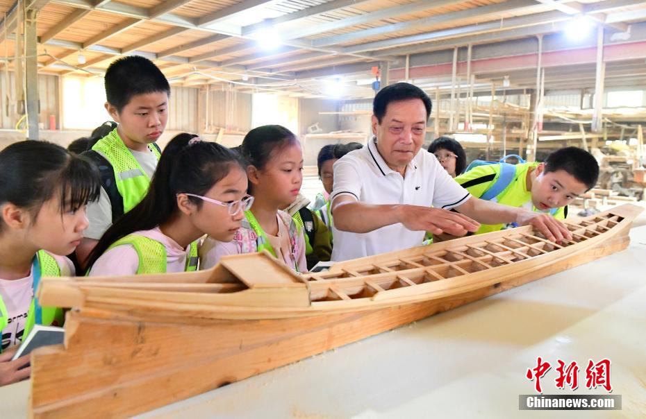 “世界龍舟看中國(guó),中國(guó)龍舟看福州,福州龍舟看方莊?!蔽挥诟=ㄊ「V菔虚}侯縣的方莊村,是中國(guó)最大的龍舟制造村,有著七百多年制作龍舟的歷史。隨著端午節(jié)臨近,方莊村內(nèi)的龍舟制造廠里,工匠們正加班加點(diǎn)趕制端午節(jié)的龍舟訂單。據(jù)統(tǒng)計(jì),目前該村每年能接到超過(guò)200艘龍舟的訂單,總產(chǎn)值約600萬(wàn)元人民幣。圖為5月25日,在方莊村的“龍舟世家”方忠雄龍舟廠里,福州市非物質(zhì)文化遺產(chǎn)“方莊龍舟制造技藝(閩侯縣)”的第三代傳人方紹晃,向前來(lái)參觀的小學(xué)生介紹傳統(tǒng)龍舟的制作工藝和過(guò)程。中新社記者 張斌 攝