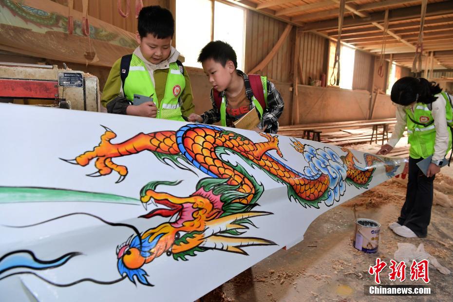 “世界龍舟看中國(guó),中國(guó)龍舟看福州,福州龍舟看方莊?!蔽挥诟=ㄊ「V菔虚}侯縣的方莊村,是中國(guó)最大的龍舟制造村,有著七百多年制作龍舟的歷史。隨著端午節(jié)臨近,方莊村內(nèi)的龍舟制造廠里,工匠們正加班加點(diǎn)趕制端午節(jié)的龍舟訂單。據(jù)統(tǒng)計(jì),目前該村每年能接到超過(guò)200艘龍舟的訂單,總產(chǎn)值約600萬(wàn)元人民幣。圖為5月25日,在方莊村的“龍舟世家”方忠雄龍舟廠里,前來(lái)參觀的小學(xué)生在體驗(yàn)傳統(tǒng)龍舟的制作工藝。中新社記者 張斌 攝