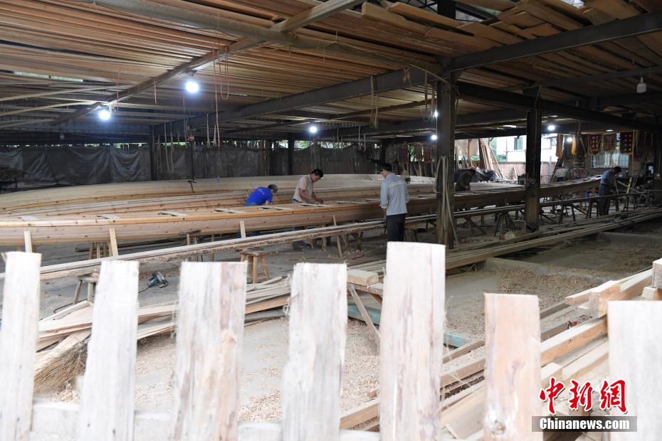 “世界龍舟看中國(guó),中國(guó)龍舟看福州,福州龍舟看方莊?!蔽挥诟=ㄊ「V菔虚}侯縣的方莊村,是中國(guó)最大的龍舟制造村,有著七百多年制作龍舟的歷史。隨著端午節(jié)臨近,方莊村內(nèi)的龍舟制造廠里,工匠們正加班加點(diǎn)趕制端午節(jié)的龍舟訂單。據(jù)統(tǒng)計(jì),目前該村每年能接到超過(guò)200艘龍舟的訂單,總產(chǎn)值約600萬(wàn)元人民幣。圖為5月25日,在方莊村的“龍舟世家”方忠雄龍舟廠里,“方莊龍舟制造技藝(閩侯縣)”第四代傳承人方劍偉在趕制端午節(jié)的龍舟訂單。中新社記者 張斌 攝