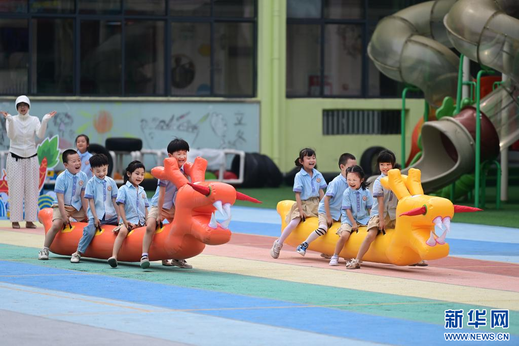 近日,在江西省宜春市萬載縣康樂幼兒園,萌娃們在進行旱龍舟比賽。新華網發(fā) 鄧龍華 攝