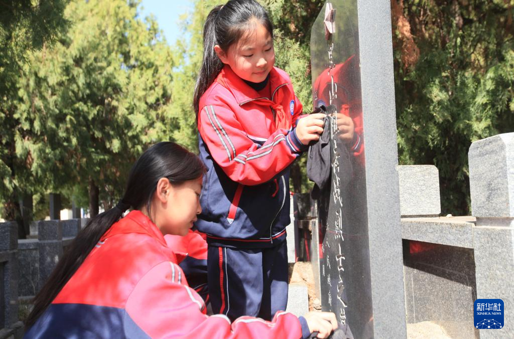 4月2日,山東省臨沂市平邑縣武臺鎮(zhèn)中心小學(xué)學(xué)生在武臺鎮(zhèn)烈士陵園擦拭烈士墓碑。