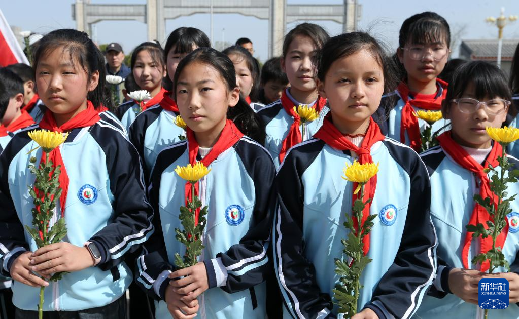 4月2日,學(xué)生在山東省滕州市烈士陵園向烈士敬獻(xiàn)鮮花。