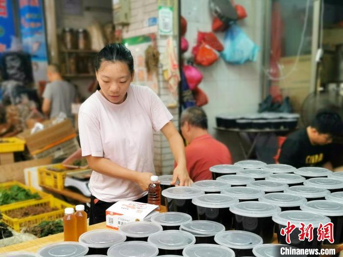 7月27日,廣東臺(tái)山市臺(tái)城富城市場,一攤主為客人打包小桶裝茯苓膏。李曉春 攝