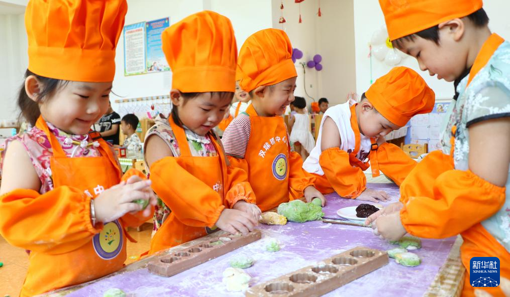 8月26日,在山東省臨沂市沂南縣雙堠鎮(zhèn)中心幼兒園,小朋友學做七夕巧果。新華社發(fā)(王彥冰 攝)
