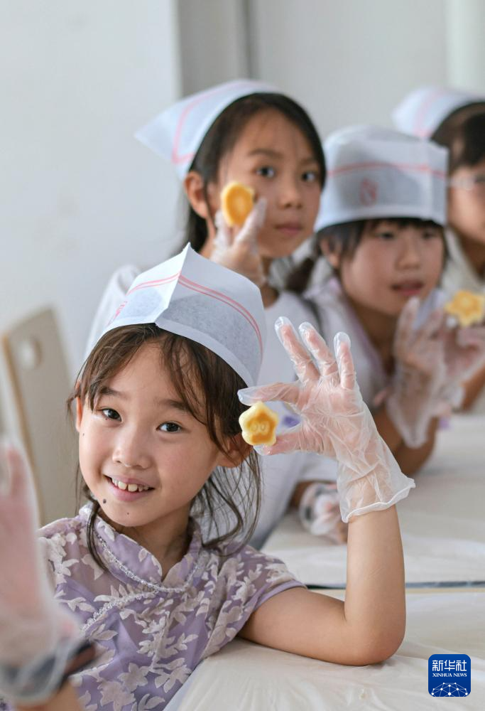 8月26日,在華能山東石島灣核電有限公司生活區(qū)食堂,暑期托管班的孩子制作傳統(tǒng)七夕美食巧花。新華社發(fā)(李信君 攝)