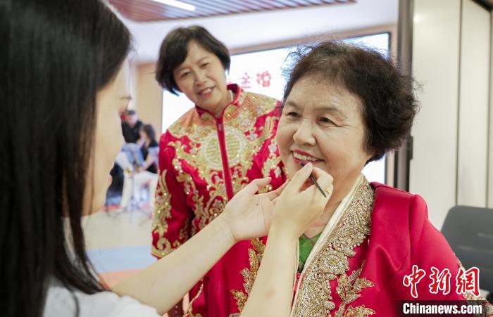 七夕將至,河北省邯鄲市老人走進(jìn)叢臺(tái)區(qū)光明橋街道天璽苑社區(qū),參加“七夕迎金婚 共創(chuàng)好家風(fēng)”慶典,回憶半個(gè)世紀(jì)的愛情。金婚慶典儀式經(jīng)過牽手入場、夫妻對拜、執(zhí)子之手、回憶往昔等環(huán)節(jié),見證了金婚夫妻們相濡以沫、互敬互愛的美滿婚姻。金婚老人結(jié)合親身經(jīng)歷,分享家風(fēng)家訓(xùn)及愛情故事,講述家庭幸福的秘訣,“曬”出婚姻保鮮的秘籍,分享婚姻的經(jīng)營智慧。圖為8月6日,老人正在化妝。王倩倩 攝