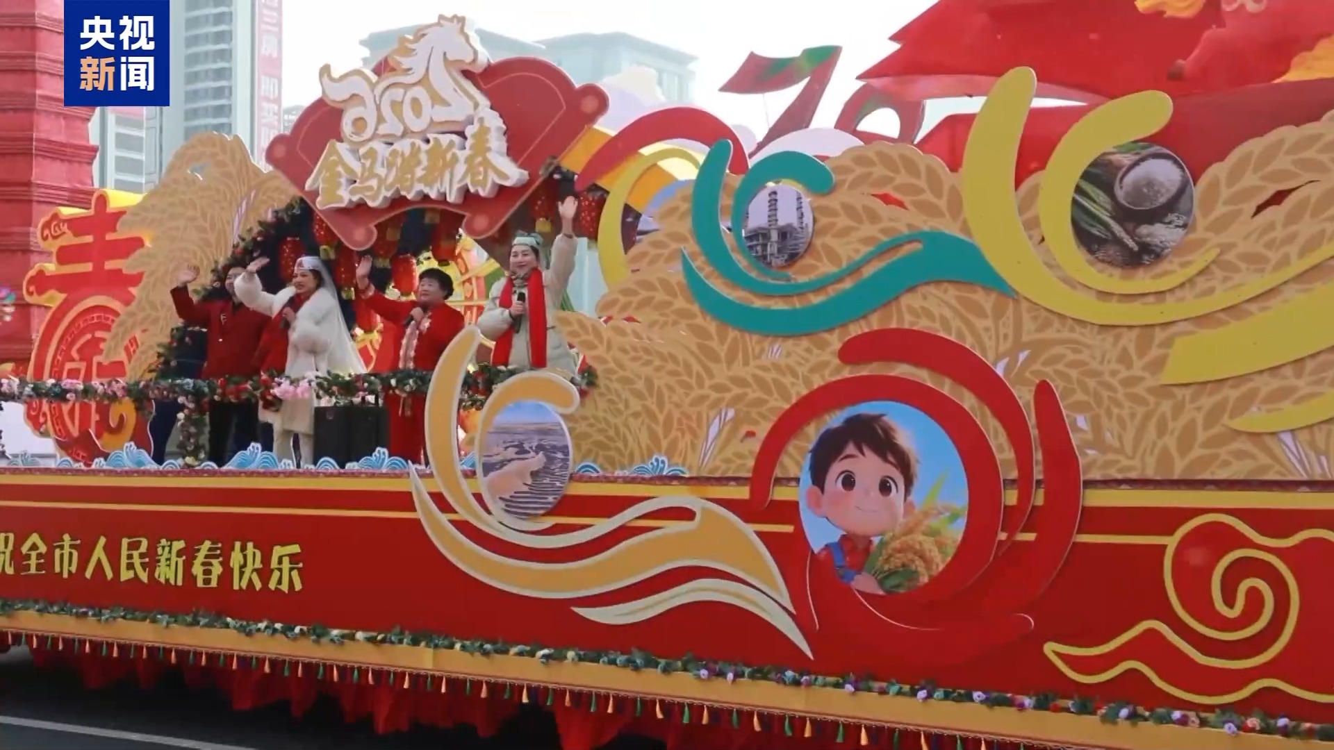 在新疆烏魯木齊的文化中心廣場(chǎng),當(dāng)?shù)卣谶M(jìn)行“打起手鼓舞起龍”的社火巡游活動(dòng)。除了鑼鼓喧天的社火氛圍之外,還有一臺(tái)臺(tái)裝飾一新的巡游花車,它們會(huì)作為這場(chǎng)社火巡游的移動(dòng)舞臺(tái)和故事主線,把新疆歌舞、馬文化以及舞龍舞獅等元素串聯(lián)起來。