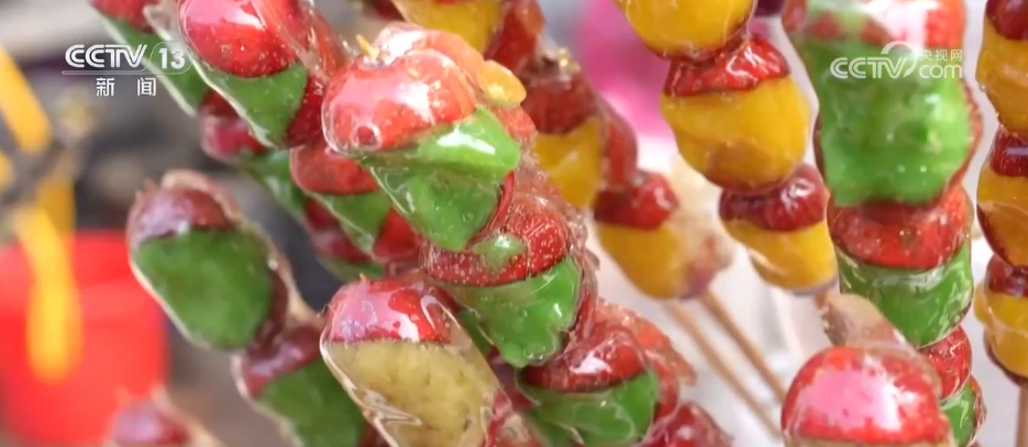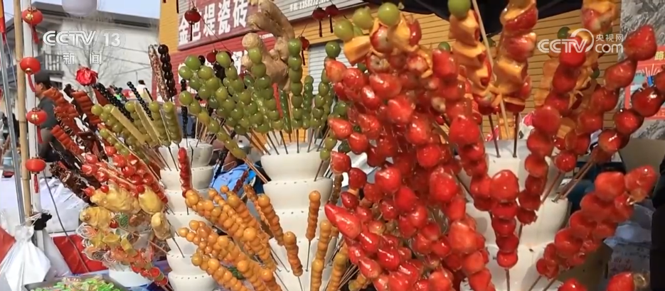 臨近元宵節(jié),在河北滄州任丘市呂公堡鎮(zhèn)的“糖墩廟會”上,摩肩接踵、人頭攢動,攤位一個接一個擠滿整條街。除了傳統(tǒng)的山楂、山藥口味,在這里,西紅柿、葡萄、草莓、柚子,甚至柿子椒、辣條也被裹上了亮晶晶的糖外衣。這些新奇的口味,吸引不少游客買來嘗鮮。