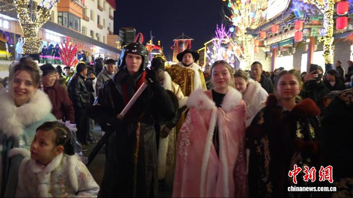 2月27日晚,身著各式傳統(tǒng)服飾的海外友人穿行于遼寧朝陽慕容街?!№n浩天 攝