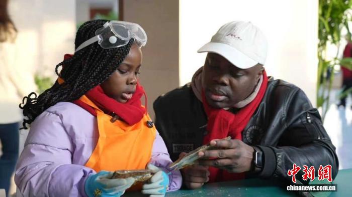 2月27日,來自尼日利亞約瑟夫(右)和女兒在遼寧朝陽鳥化石國家地質(zhì)公園化石體驗(yàn)區(qū)親手“開化石”?!№n浩天 攝