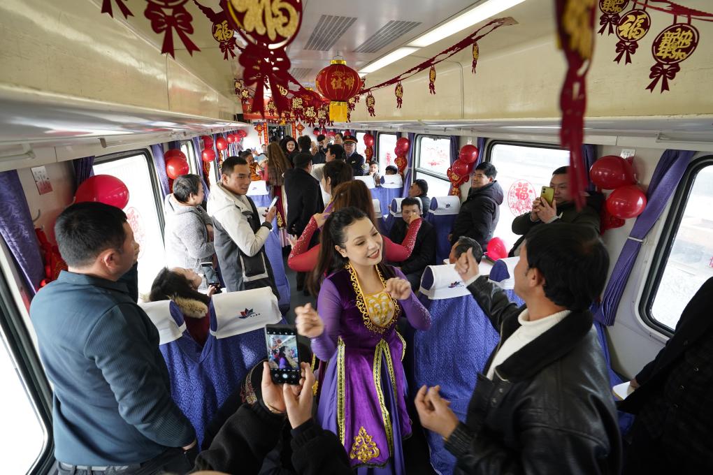 各族群眾在列車“巴扎”上載歌載舞。新華社記者白志強攝