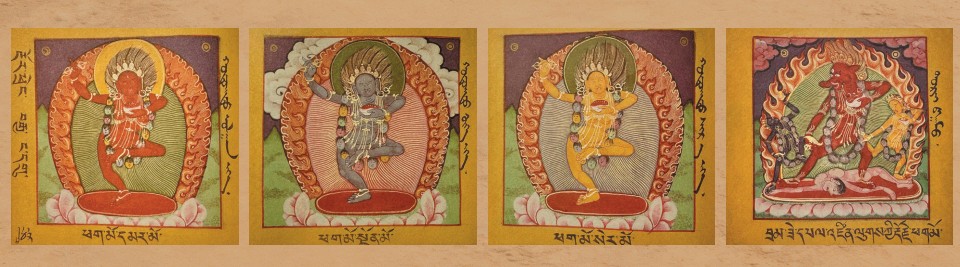 藏文佛經(jīng)古籍中的金剛亥母形象,左起依次為紅色金剛亥母、藍(lán)色金剛亥母、黃色金剛亥母、靜行吉祥持所傳金剛亥母。楚翹翻拍自《五百佛像集:見即獲益》