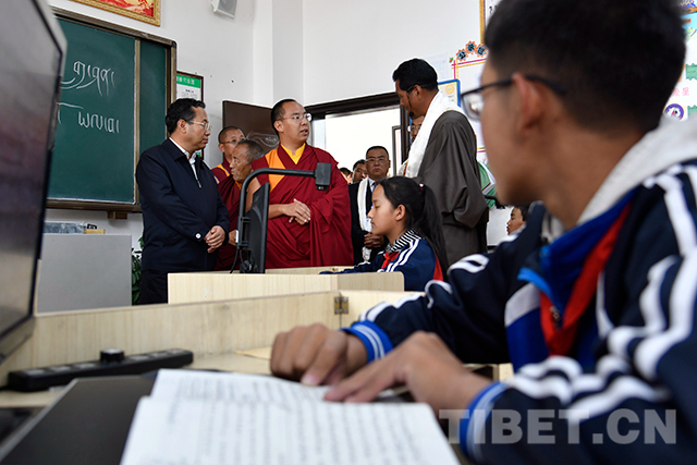 圖為十一世班禪在電教室了解學(xué)生學(xué)習(xí)情況。攝影:王淑
