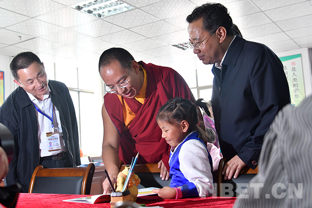 圖為十一世班禪在圖書室了解孩子們的學(xué)習(xí)情況。攝影:扎西