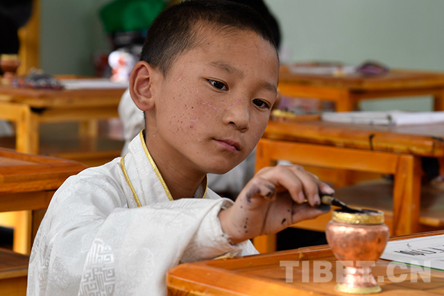 圖為藏文書法室里孩子們正在練習(xí)書法。攝影:扎西