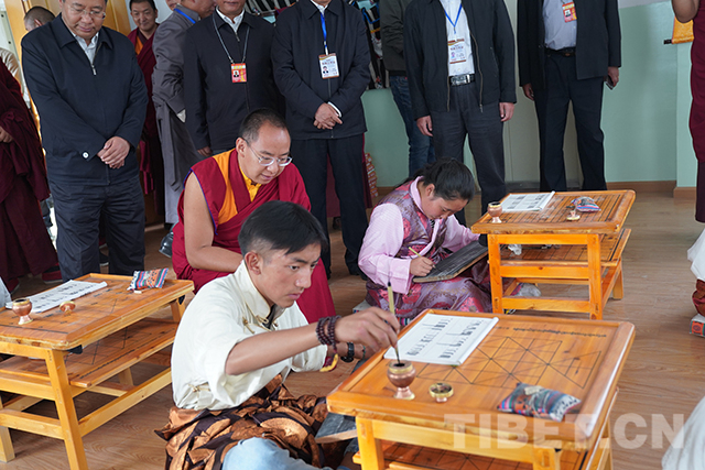 圖為十一世班禪仔細(xì)查看殘疾學(xué)生學(xué)習(xí)情況。攝影:扎西