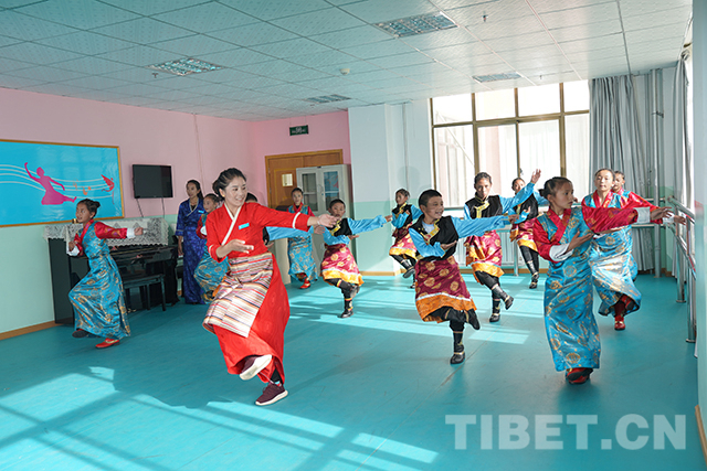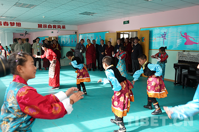 圖為十一世班禪來(lái)到舞蹈室觀看孩子們跳舞。攝影:王淑