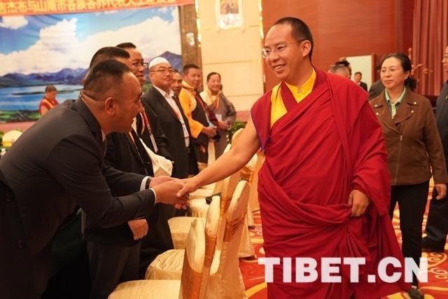 圖為:座談會(huì)后十一世班禪與參會(huì)代表握手。攝影:王淑