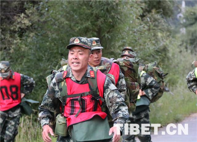 圖為藏族班長(zhǎng)覺次仁,一人肩扛兩個(gè)背囊,“飛奔”在五公里武裝越野比武考核的路上。
