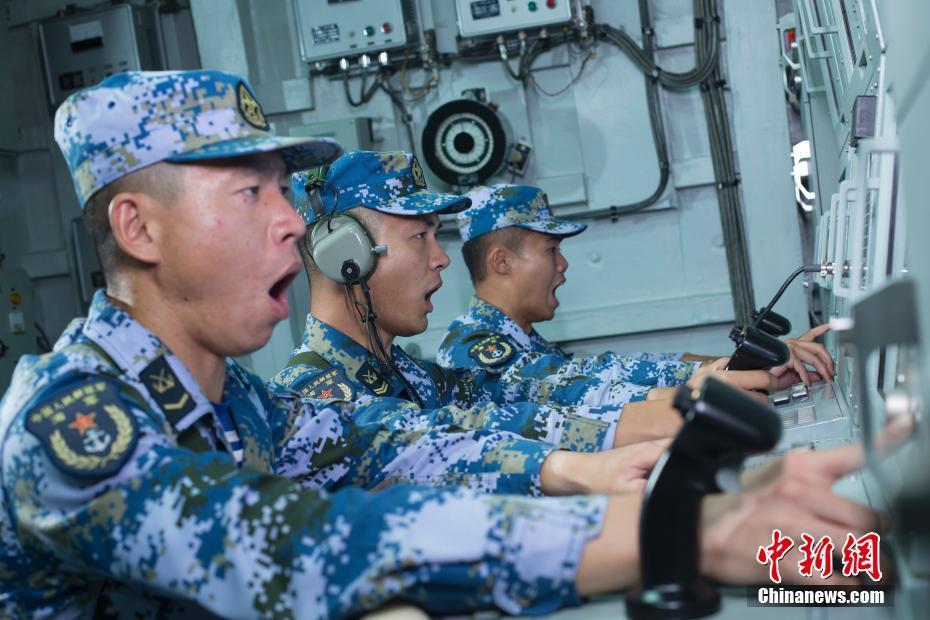 記者近日登上??谂?,近距離探訪這艘被譽為“中華神盾”的海軍艦艇。圖為??谂炦M行防空反導演練期間,官兵操縱副炮打擊來襲目標。(資料圖片)中新社記者 王棟 攝