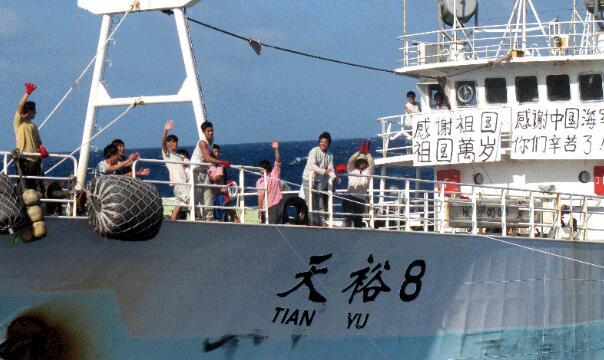 看到??谂?,“天裕8號(hào)”船員就像見到了久違的親人,紛紛走上甲板,歡呼著向??谂灀]手致意,并在船上升起一面鮮艷的五星紅旗。他們年齡大約在二十歲左右,在甲板上行走如飛,如履平地一般。