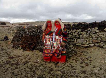 瑪旁布姆卡是西女國女王居住的城堡,普蘭縣文化局局長加措根據(jù)藏文大字典和《阿里史地探秘》的“瑪旁布莫卡”,解釋出“布”的漢文詞義,就是女人、女性、女子或者女王?!澳本褪窍悴莼蛘呦悴荼椴即松?。據(jù)當?shù)匕傩战榻B,城堡遺址坐落在普蘭神湖瑪旁雍措湖的東部扎藏布溫泉溝南側的野嶺上,海拔5000米上下。在遺址上部高處還有一個碩大蘑菇形狀的巖石巋然迎風屹立城堡上方,與下方城堡遺址交相輝映。這即是“出俞石、朱砂、麝香、牦牛、駿馬、蜀馬,尤多鹽,恒將鹽向天竺興販,其利數(shù)倍”西女王國的王城。在城堡上方更高處的山后,遺留有眾多的洞穴,說明女國的百姓就居住在女王的周圍。此外在山坡的下方扎藏布溝處,當?shù)匕傩辗Q這塊地方為“卡爾青”,意思是大城堡之地。盡管史書上的記載十分有限,瑪旁布姆卡的故事仍然世世代代流傳在當?shù)匕傩盏男闹小;魻柎逡晃荒赀~的老百姓告訴筆者,溫泉溝和曲古寺廟附近就有許許多多女王的傳說,聽說女王曾經(jīng)在此沐浴,但不知具體在什么地方。