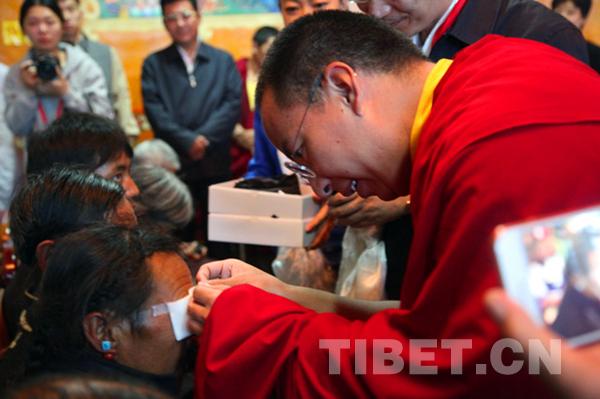 捐贈儀式當天,接受復明手術的32名老年白內(nèi)障患者,帶著他們的感激之情來到捐贈儀式現(xiàn)場,十一世班禪小心翼翼地親手逐一為患者們揭開了覆蓋在眼睛上的紗布,并向他們贈送了護目眼鏡。圖為十一世班禪細心地為患者揭開覆蓋在眼睛上的紗布。攝影:王淑
