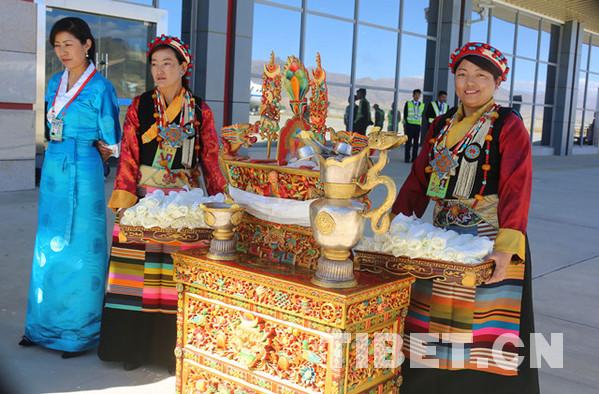身著盛裝的禮儀人員向十一世班禪敬獻“切瑪”與青稞酒。攝影:王淑。