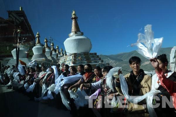 班禪大師到來當(dāng)天,結(jié)古寺大門口煨桑的香煙繚繞,用白石灰畫的迎接道花紋華美,玉樹市的群眾在道路兩旁歡迎班禪大師的車隊(duì)。