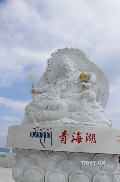 7月23日上午10點(diǎn),青海湖二郎劍景區(qū)祭海臺上,一隊(duì)肅立的藏傳佛教僧人簇?fù)碇晃欢俗ㄅ_前的年輕僧人,虔誠念誦經(jīng)文,祈禱世界和平,國泰民安,風(fēng)調(diào)雨順,生態(tài)平衡,眾生幸福。這些僧人的絳紅色僧衣,映襯著青海湖碧藍(lán)色的波濤和水洗般的天空,袈裟和經(jīng)幡隨風(fēng)翻飛,發(fā)出噼啪的聲音,漢白玉雕塑的青海湖湖神塑像,屹立在祭海臺的中央。這是十一世班禪來到青海湖。祭祀祈福的經(jīng)文念誦結(jié)束后,一位僧人拿出裝藏好的寶瓶,從祭海臺走到湖邊,將寶瓶投入蔚藍(lán)色湖水中。這是藏傳佛教傳統(tǒng)的祭湖儀式??吹竭@一景象,周邊的人們心底都無由生起衷心的歡喜,相信這個寶瓶承載的美好希望一定能夠如愿如意。