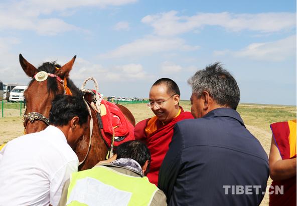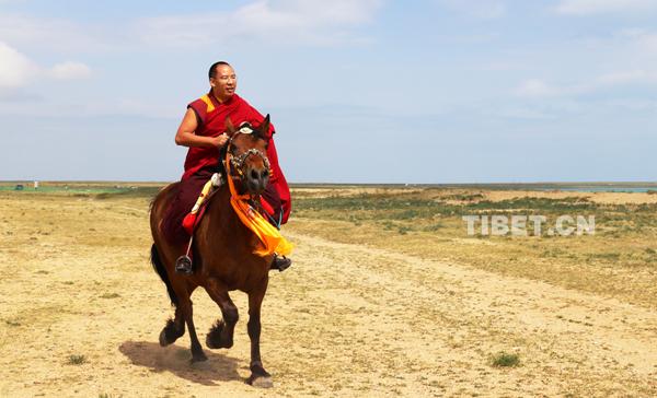 祭海儀式結(jié)束后,十一世班禪一行環(huán)湖游覽,在湖邊見到牧民斗改杰一家正牽著馬迎候。他們希望瞻禮到大師的尊容,為自己帶來福運(yùn)。十一世班禪一時興起,想要騎騎他們的馬。斗改杰一家平時在青海湖二郎劍景區(qū)經(jīng)營旅游騎馬項(xiàng)目,沒想到今天這樣幸運(yùn),十一世班禪騎著他們的馬,在青海湖邊七月鮮花盛開的草原上,瀟灑地馳騁了幾個來回。他們激動地都說不出話了。