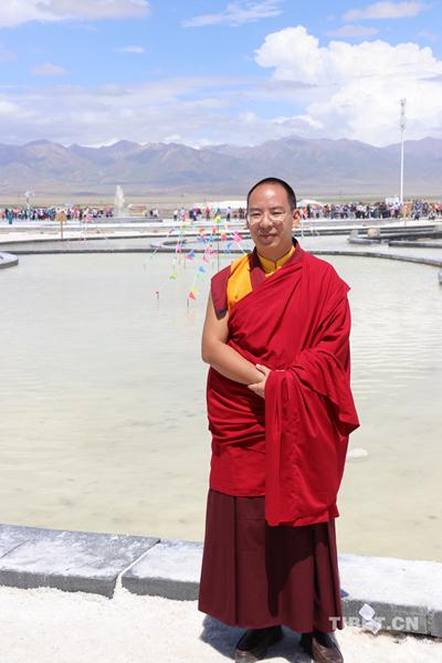 十一世班禪在茶卡鹽湖邊的敖包前誦經(jīng)祈福。